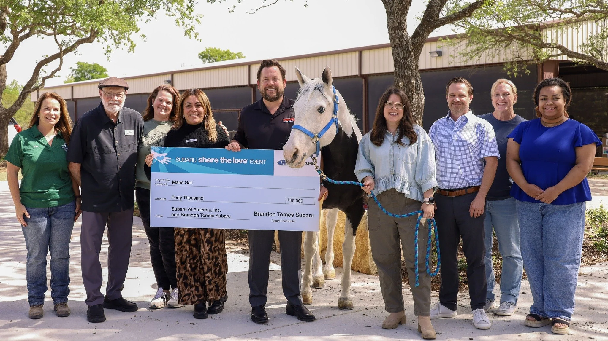 This year, marking 10 years of dedication and support, ManeGait was honored to be selected as a hometown charity by Brandon Tomes Subaru for their participation in the nationwide Subaru Share the Love Event. We were thrilled to welcome the Tomes Subaru team to ManeGait as they presented a generous gift of $40,000. This contribution was made possible through the generosity of community members who chose ManeGait as their charity of choice when purchasing a Subaru vehicle.