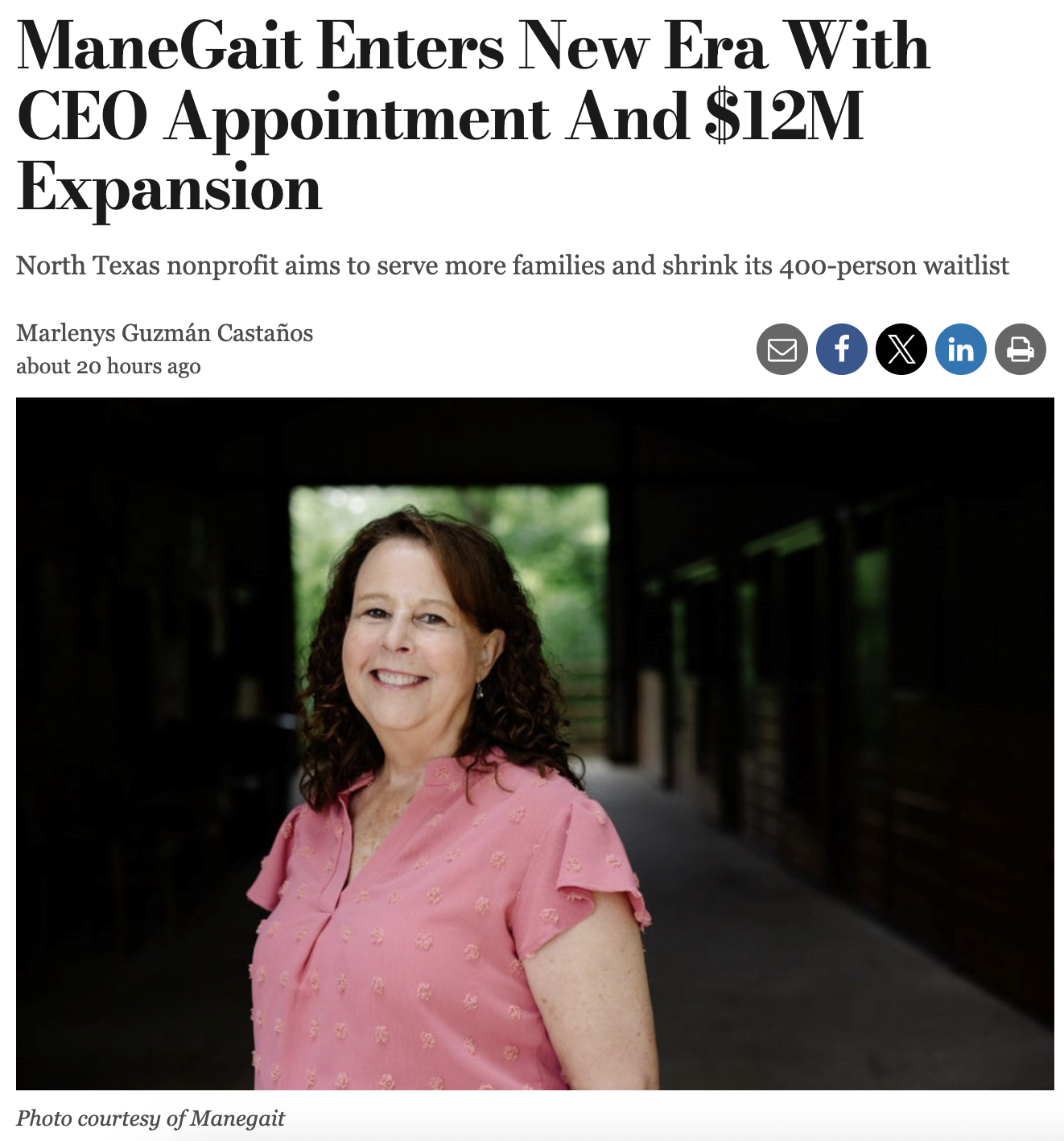 DALLAS, TX, [ August 4, 2025] — ManeGait, North Texas’ multifaceted equine therapy organization empowering children and adults with disabilities to move beyond their boundaries through the healing power of horses, proudly announces its new Chief Executive Officer, Tricia Nelson.