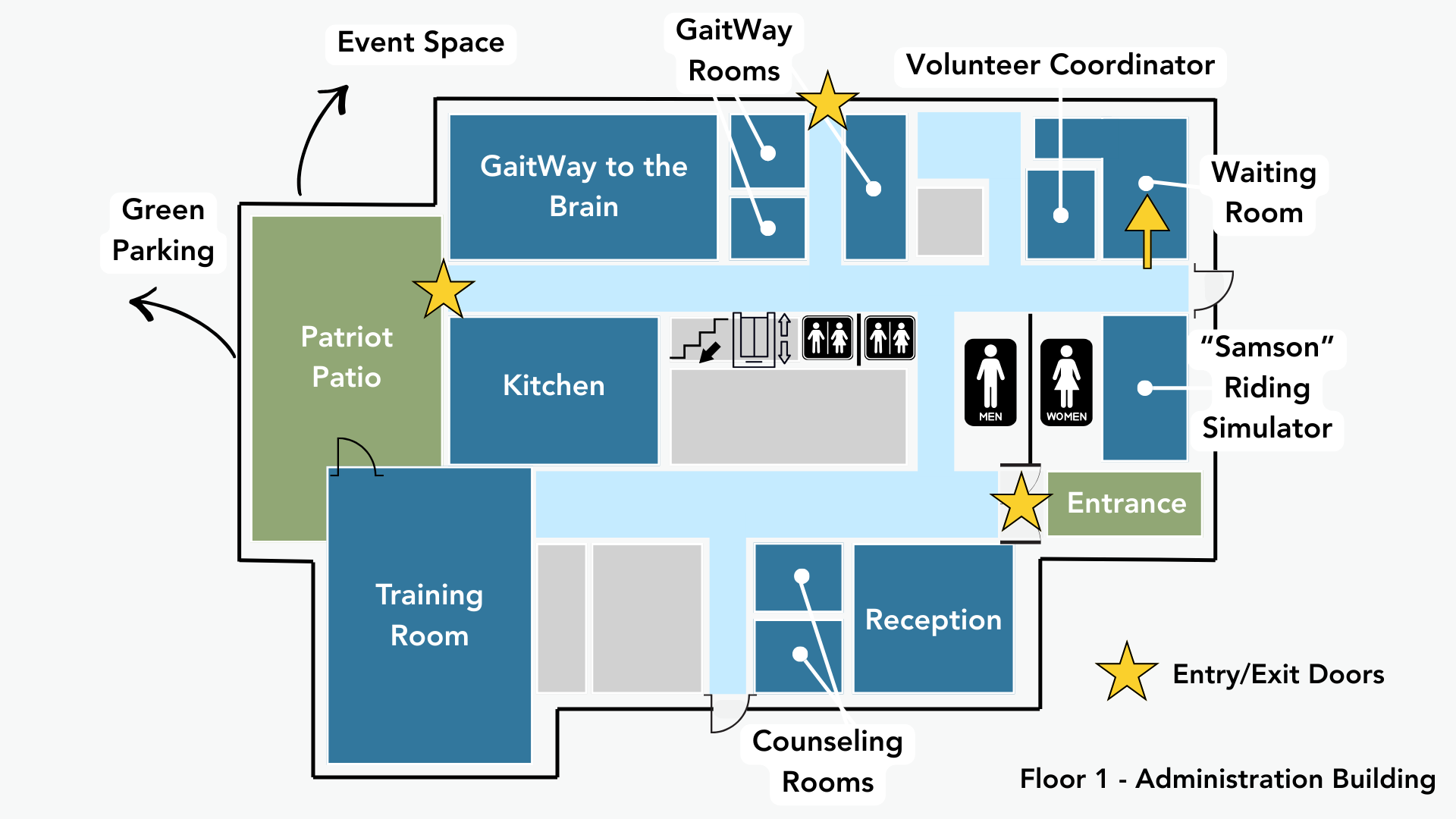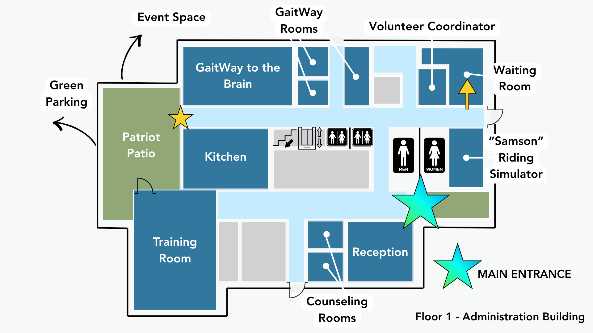 Side Walkers meet your riders in NEW Building Waiting Room on 1st Floor (see map below)